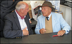 | One of the highlights of my trip to Goodwood 2011 was that I got a second opportunity to meet personally with Sir Stirling Moss on Saturday 17th September which was his eighty second birthday. Exactly six years previously I had the same privilege on his seventy sixth birthday except this time I got a photograph! Shortly after this shot SM drove two celebratory laps around the Goodwood circuit in a Ferrari 250 GT SWB. Thanks to Philip and Julie Porter for arranging this encounter. | ![]() |