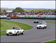 | Friday is the official practice day and the least crowded in the Paddock. Here you can see the 'D'-types including the famous 774 RW Le Mans car. This 1955 'long nose' 'D'-type driven by Anthony Reid in the Sussex Trophy has been driven by such notables as Mike Hawthorn, Win Percy and Ivor Bueb. The green 1954 'D'-type bottom right, was driven by owner Lukas Huni in the same race. Top right is the beautiful 1952 Allard J2X owned and driven by Alan Patterson. A third 'D' -type is being pushed into position. A truly amazing collection of classic cars |